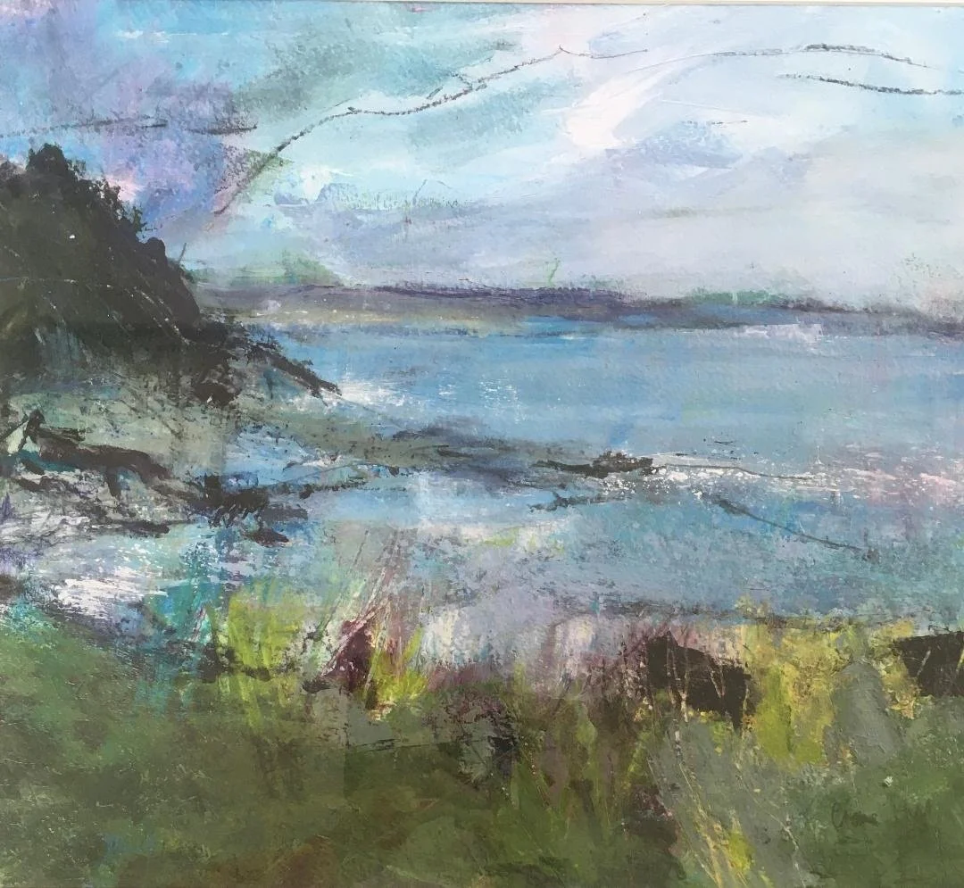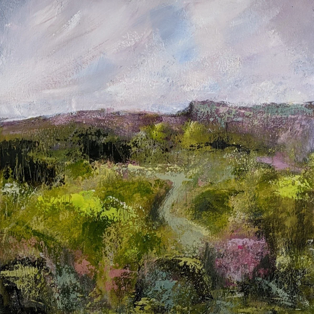 I love to paint things that bring me joy – sometimes a still life, sometimes a landscape inspired by Scotland, Cornwall or the Peak District. At other times I paint purely abstractly, inspired by my love of colour and texture. In my landscapes I try to create paintings that describe a sense of place and the feelings that the places evoke in me. I work from both observation and memory. I work mainly in acrylic, but I also use charcoal, pencil, collage, ink and pastel. I work on several pieces at a time, moving from one to the other. I start with intuitive mark making and build up many layers of paint and scrape through, sand back and rework to reveal the history of the painting.